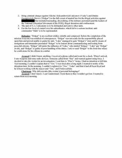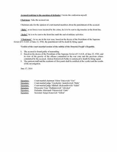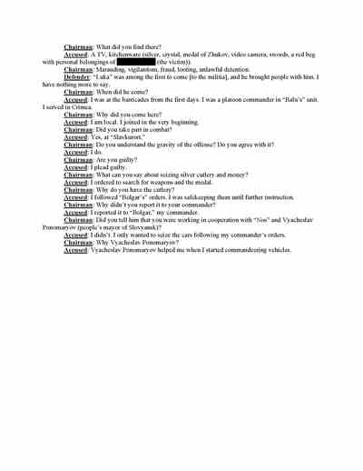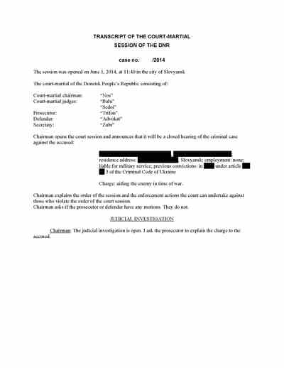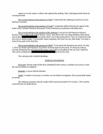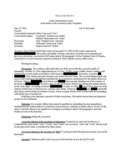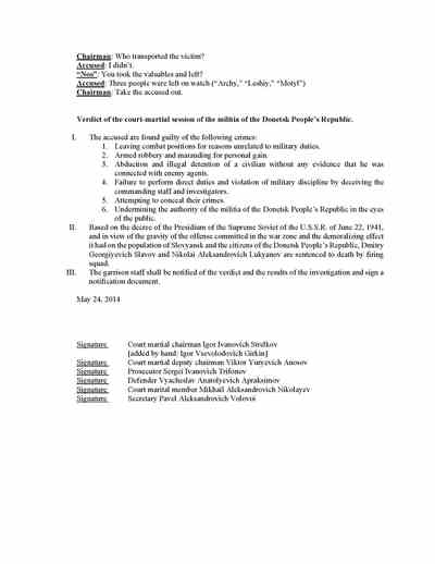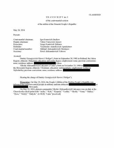 Trifonov said he followed Strelkov to Slovyansk. There, the documents recovered from Strelkov’s headquarters show, Trifonov acted as “tribunal” secretary in the Pichko case and prosecutor in the “trial” of Lukyanov and Slavov. He was also the prosecutor in the case of the man acquitted of treason.