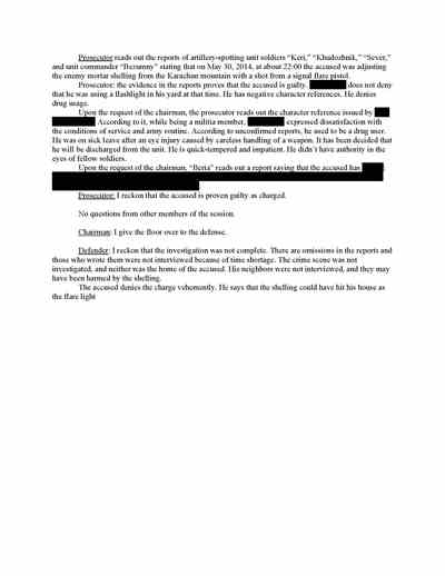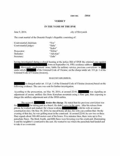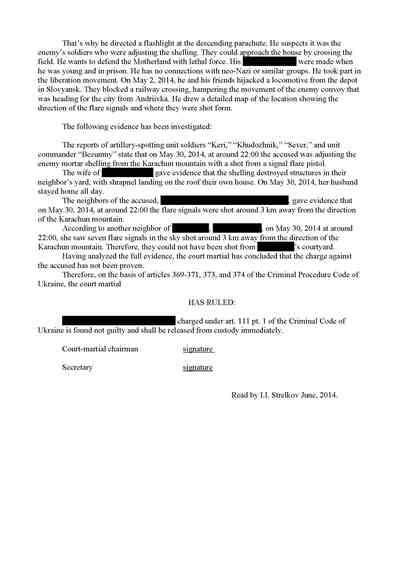 These pages show the not-guilty verdict of a Ukrainian man facing treason charges for shining a flashlight during an artillery exchange with Kyiv’s forces, thus purportedly betraying separatist positions.