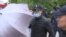 Black-clad, masked men in Kazakhstan are blocking media coverage of opposition events by opening umbrellas in front of video cameras.